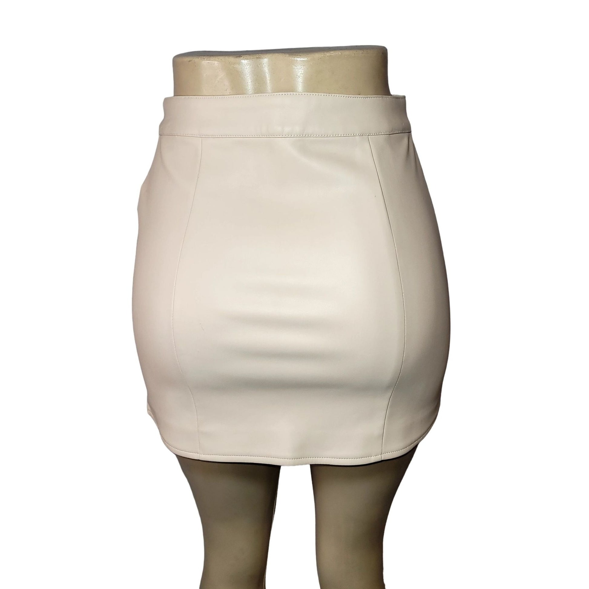 Women mini skirt, beige color leather, full zipper on front the material inside is very soft like velvet fabric, can wearing with boots, heels or flat shoes casual occasion or party